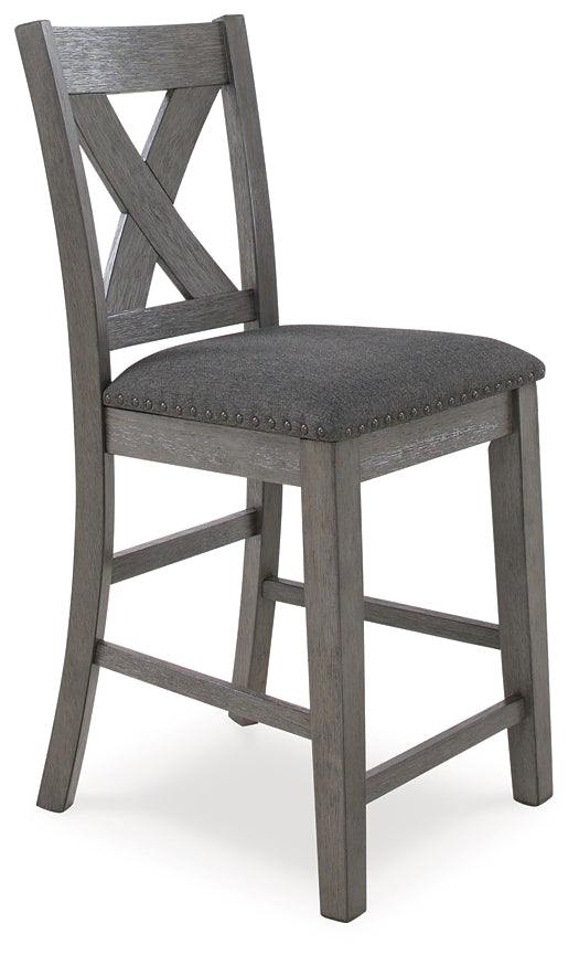| Details | Includes counter height dining table and 6 counter height bar stools, Table made with hardwood solids, acacia veneer and MDF substrate, Stools made with solid hardwood frames, Antiqued gray wash finish, Polyester upholstery, Foam cushioned seats, Nailhead accents, Assembly required | |