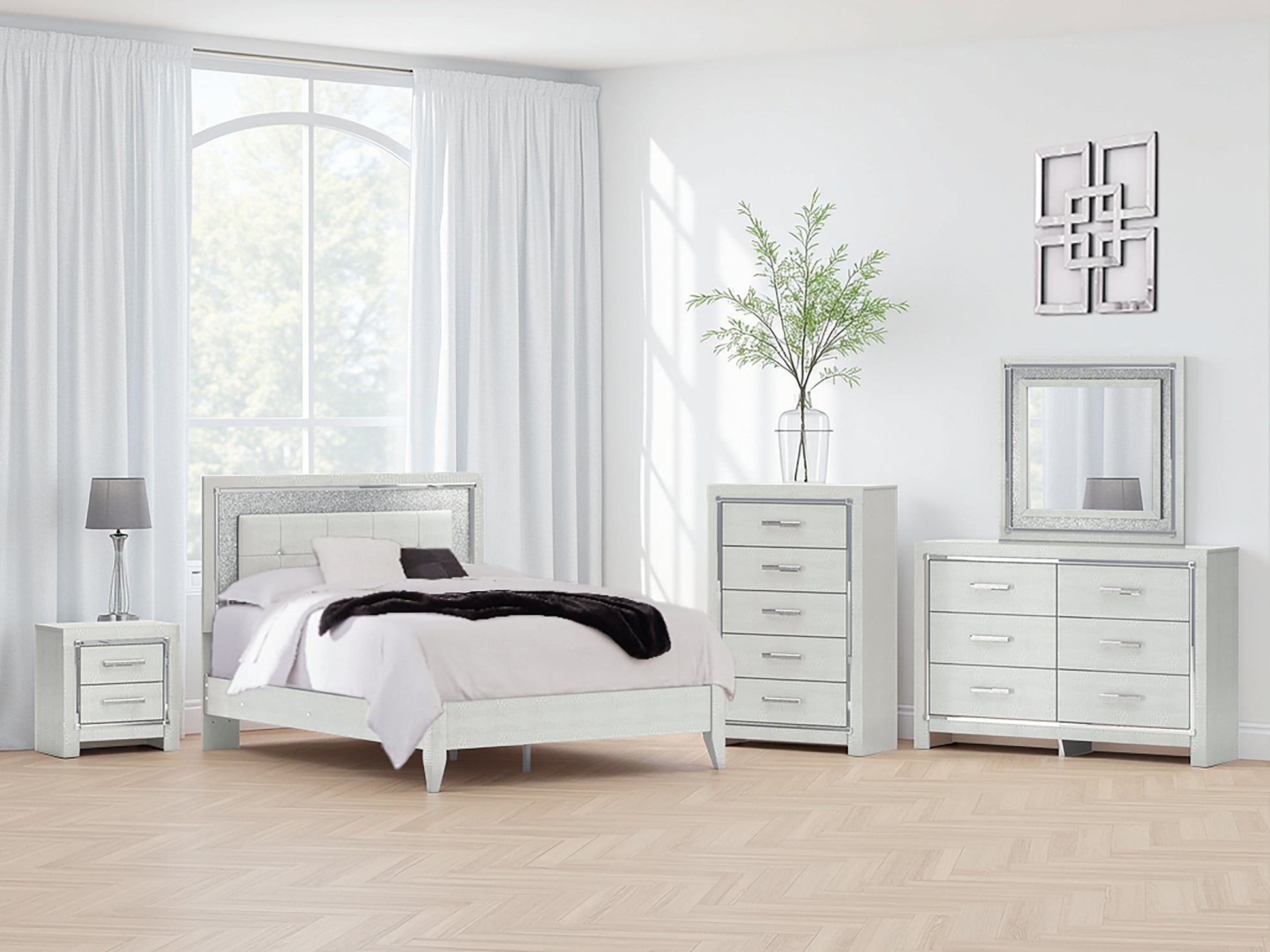 | Details | Includes upholstered panel headboard and panel footboard with rails, Made with engineered wood (MDF/particleboard/plywood) and decorative laminate for the right balance of affordability and durability, Silvertone pearl finished faux gator, Decorative laminate replicates natural or man-made material surfaces with consistent color, pattern and texture, Headboard with faceted chrome-tone details, faux crystal tufted silver upholstery with faux alligator effect and glitter inlays, Headboard includes LED lighting with remote for color and brightness options; included holder discreetly keeps remote accessible, Foundation/box spring required, sold separately, Mattress available, sold separately, Minor assembly required | |